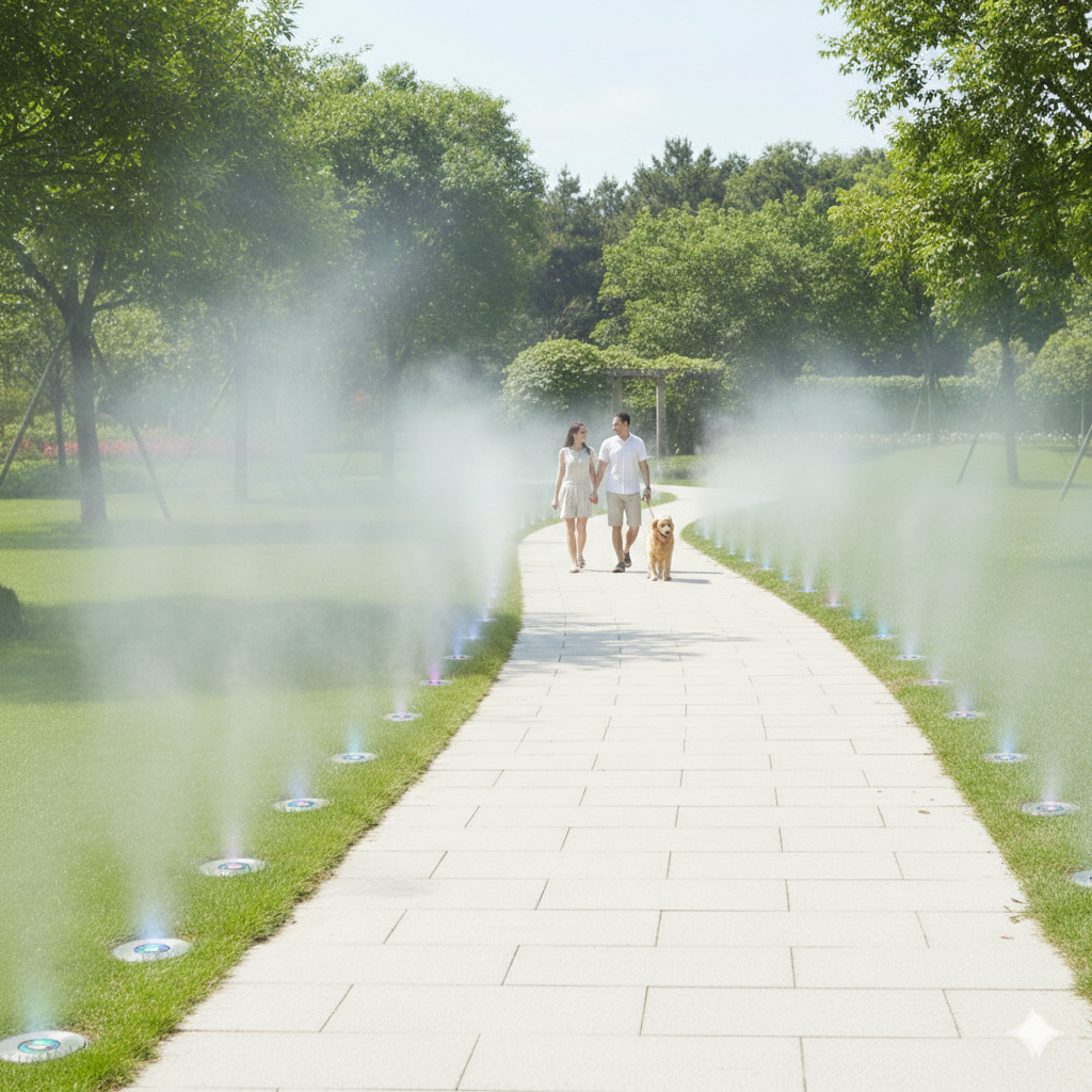 바닥에서 피어오르는 미세안개로 공간의 온도를 낮추고 감성을 더하는 스마트 바닥미스트 솔루션초미립 안개 분무로 체감온도를 효과적으로 저감하고 쾌적한 보행 환경 제공 보행로·광장·공원 등 다양한 공간에 매립 설치가 가능해 경관을 해치지 않음 스마트 제어 연동으로 운영 효율과 유지관리를 동시에 만족